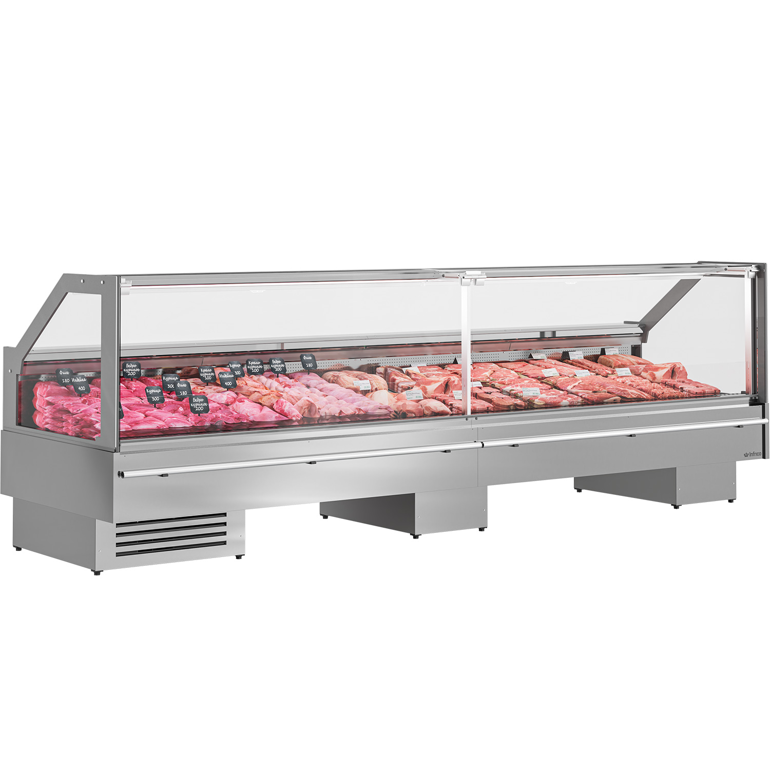- Butcher’s showcases for remote assisted service, or built-in group eco R290 (U), models total stainless steel interior and exterior AISI304 (CP/UCP) and models interior stainless steel/exterior painted Infrico letter (ICP/IUCP).